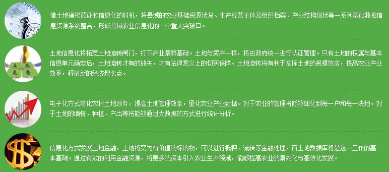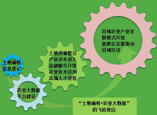 国家推动的土地确权登记,如同90年代的商品房改革,这次通过确权登记确立了农民的财产权,是本次农业改革的灵魂,也将彻底激活农业经济的发展,使其成为带动中国经济增长的新亮点!通过土地确权登记,完成土地信息化,这是农业信息化的第一步,接着通过农业大数据应用平台建设,有效地把县域农业生产要素和信息整合起来,形成一个对外的接口,这样才能高效融入互联网行业的发展,利用互联网思维改造当地农业,加速推进县域农业产业集群的发展,增强县域经济的核心竞争力!